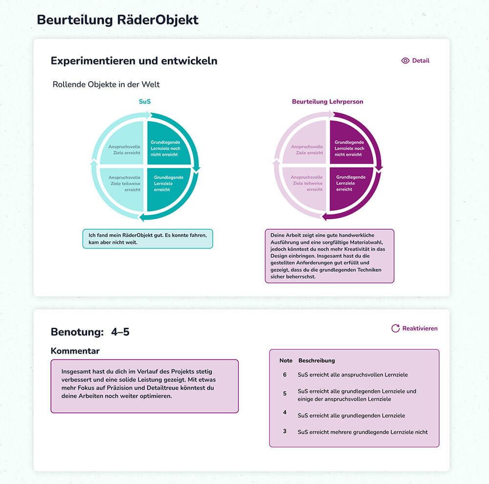stitch! aktivierenSchülerinnen und Schüler beurteilen sich nach anspruchsvollen und grundlegenden Lernzielen und laden Fotos als Beispiele hoch. Lehrpersonen können die Selbstbeurteilungen der Schülerinnen und Schüler ansehen, eine Fremdbeurteilung abgeben und bei Bedarf daraus eine Note ablesen.