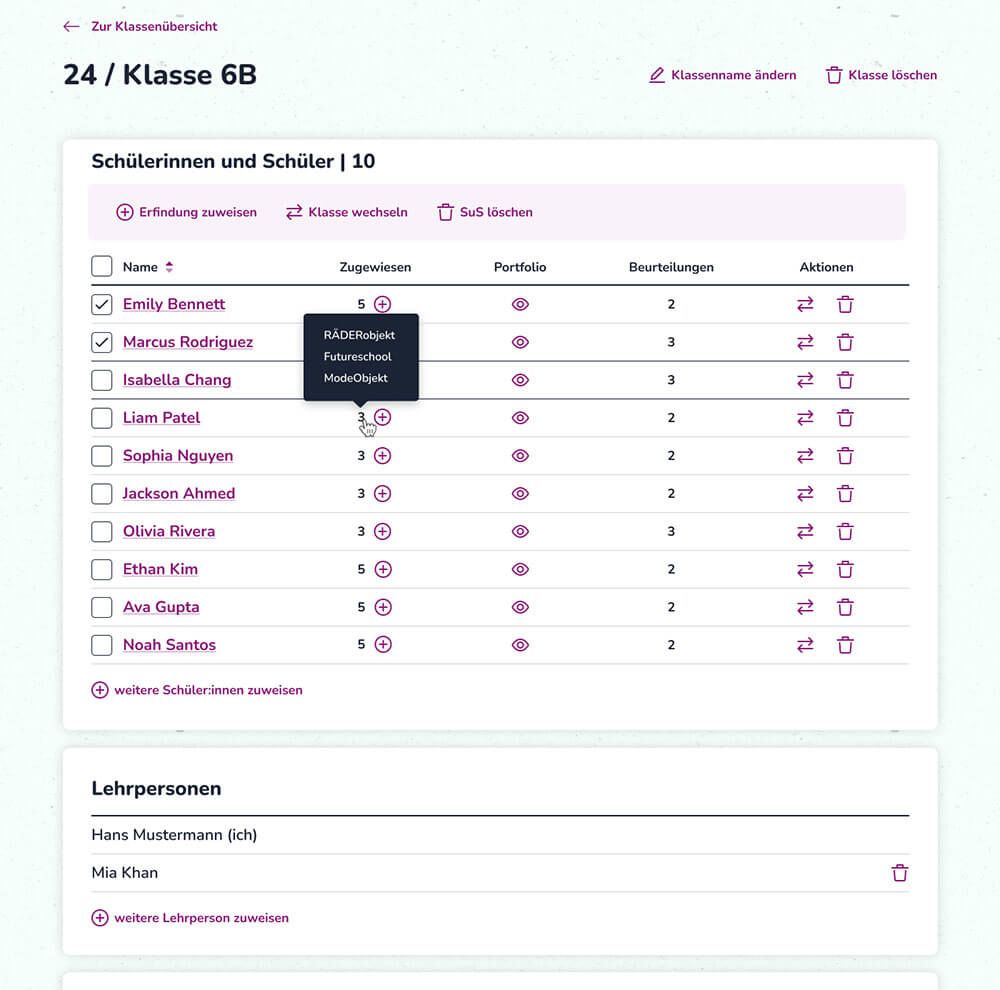 Die Klassenübersicht ermöglicht es den Lehrpersonen, den Lernfortschritt der gesamten Klasse sowie einzelner Schülerinnen und Schüler detailliert zu verfolgen und zu verwalten. Sie können Schülerinnen und Schüler den Klassen zuordnen, ihnen Erfindungen zuweisen, direkt auf ihre Lernportfolios zugreifen, Beurteilungen und Noten abgeben und weitere Lehrpersonen dazu nehmen.